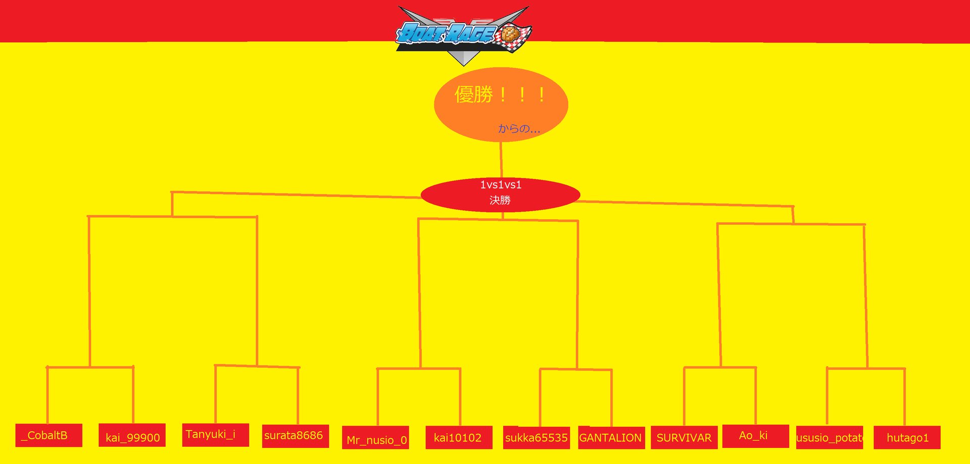 ※人数の都合上、決勝のみ1vs1vs1とします。そのため4位はなしとします。