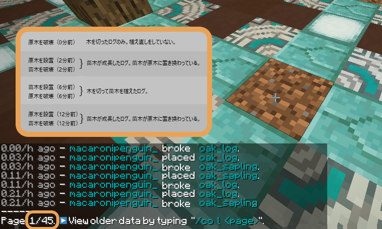 表示される行動ログは、ブロック設置(placed)、ブロック破壊(broke)、チェスト収納(added)、チェスト取り出し(removed)、ドア等のクリック(click)の5種類あります。一番上の最新ログはbroke(破壊)ログですから、"macaronipenguin_"というプレイヤーが0分前にオークの原木を壊した、という意味になります。