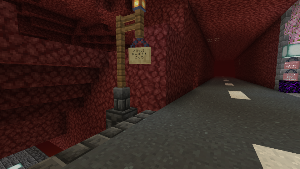 Z=-250 のところで「とかれふれんぽう! こっち ←」と書かれた看板があるので, 看板の方向に少し進むとトカレフ連邦に出られるネザーゲートがあります